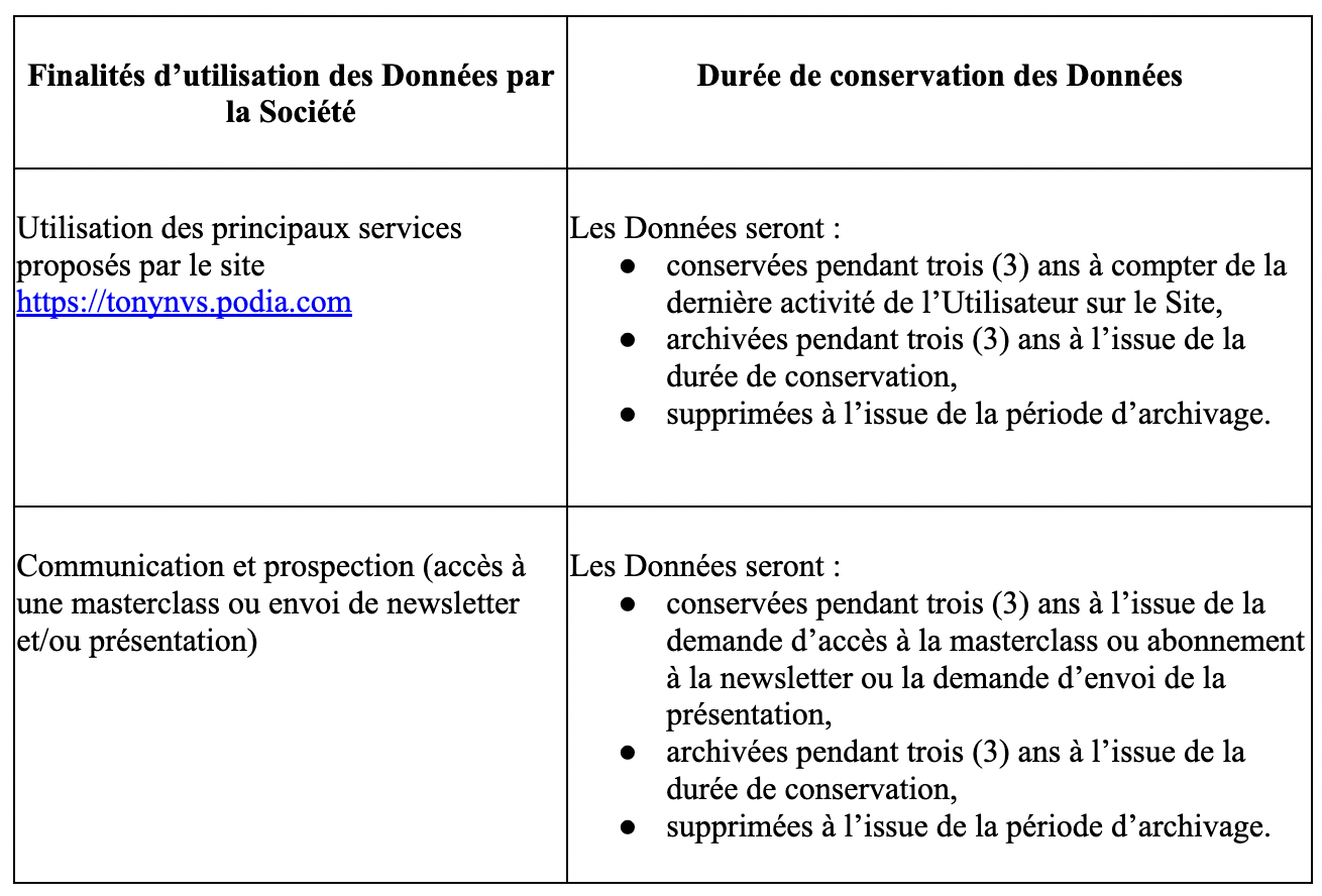 Une fois la phase de conservation dite « active » passée, la Société procédera à l’archivage intermédiaire desdites Données (c’est-à-dire que les données personnelles ne sont plus utilisées pour atteindre l’objectif fixé mais présentent encore un intérêt administratif pour la Société (ex : gestion d’un éventuel contentieux, etc..) ou doivent être conservées pour répondre à une obligation légale.